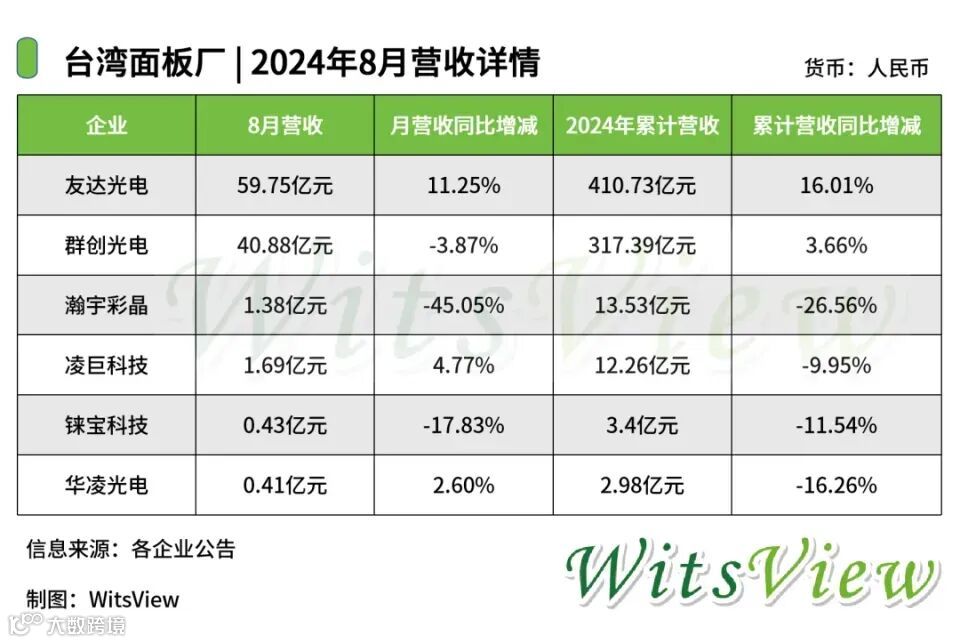 截至9月9日,友达光电、群创光电、瀚宇彩晶、凌巨科技、铼宝科技和华凌光电这六家台湾面板厂公布了2024年8月营收情况。