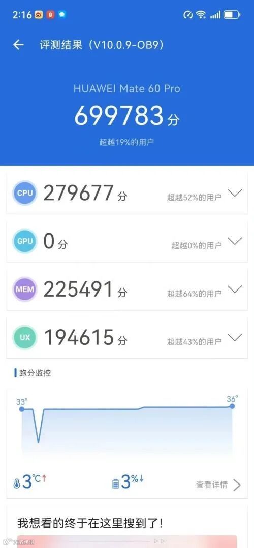 有网友给 Mate 60 Pro 安装了检测软件,并晒出了检测的结果。