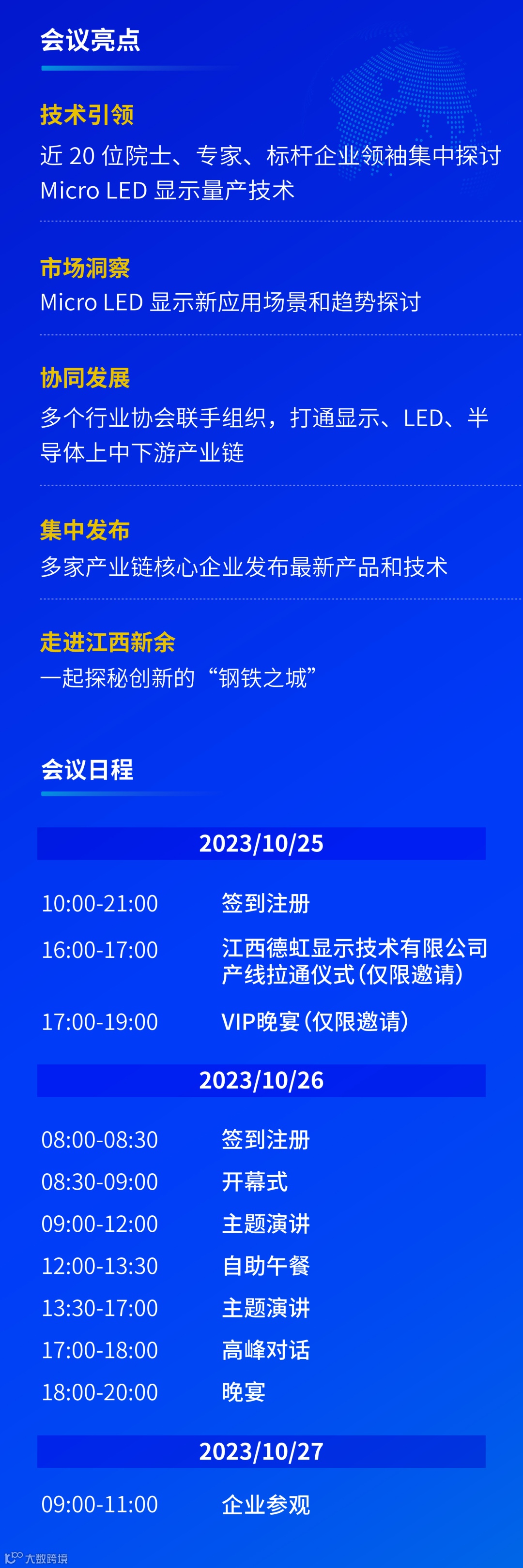 2023第六届中国(国际)Micro LED 显示高峰论坛由南京平板显示行业协会、中国光学光电子行业协会液晶分会、中国半导体照明/LED产业与应用联盟、中国电子材料行业协会、台湾显示器产业联合总会主办,将于2023年10月25日至27日在中国新余召开,本次论坛以"技术先导 显示无限"为主题,通过对技术路线的回顾和展望,聚焦Micro LED量产关键技术突破和产业链建设,展示最新技术和相应产品、推动和完善产业链安全及配套对接,促进产业链进一步健康发展。