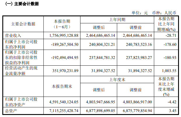 龙腾光电(688055)8月29日晚间发布半年报,上半年实现营业收入约17.57亿元,同比下降28.71%;净利润亏损约1.89亿元,去年同期实现净利润约2.41亿元,同比转亏。