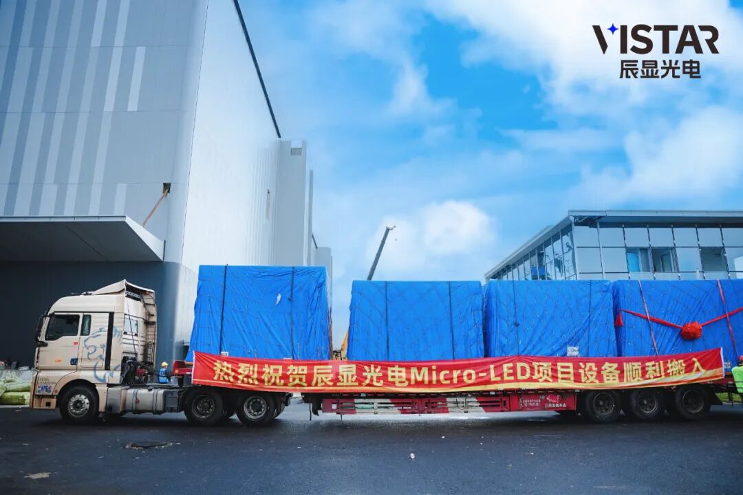 随着设备搬入的礼炮声响起,一辆辆装载着Micro-LED设备的卡车缓缓驶入厂房。值得一提的是,此次搬入的设备中,有多台是由辰显光电与设备厂商联合研发的首台套,涵盖了多个关键工艺,确保自主可控的技术路线,同时也助力国内Micro-LED产业链的协同发展。