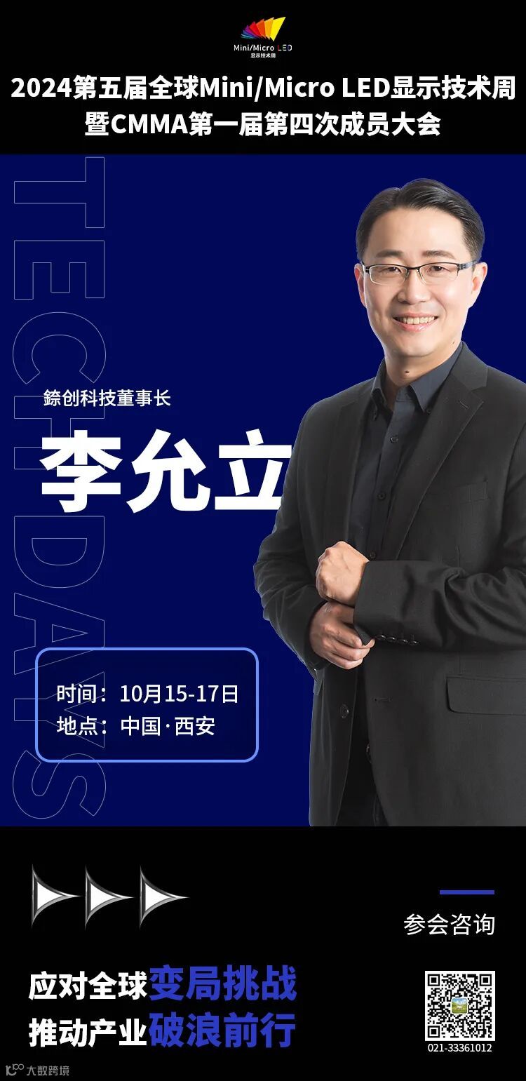 錼创科技董事长李允立将出席2024第五届全球Mini/MicroLED显示技术周暨CMMA第一届第四次成员大会并发表演讲,敬请期待!