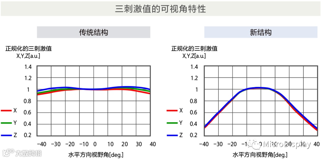 由于从微透镜中射出的光线会更加平行,因此具有在正面方向可达到峰值的特性。该特性对于AR眼镜等偏光光学系统及光波导光学系统来说,是非常具有优势的。同时,该特性还有助于将相邻的彩色滤光片之间的干扰降至最小程度,产生如下图所示的可视角改善效果。从斜向进行观测时的三刺激值偏离也变得很小,具有改善偏色的效果。