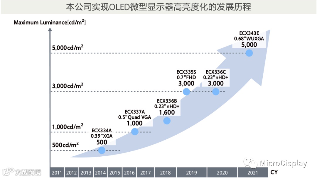 SSS除了通过导入微透镜技术来提升亮度之外,还持续不断地采取了改善发光效率的有效对策,如下图所示,分阶段地提高了最大发光亮度。今后,为了扩大OLED微型显示器产品的应用,我们还将继续努力,进一步推进亮度的提升。