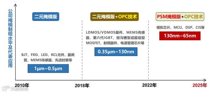 2022-2025年,公司在保持半导体掩模版领域优势的同时,工艺水平将不断向高端制程推进。其目前正在建设高端半导体芯片掩模版制造基地,建成后将实现130-65nm半导体工艺节点掩模版量产,下游应用在模拟芯片、MCU、DSP、CIS芯片等。