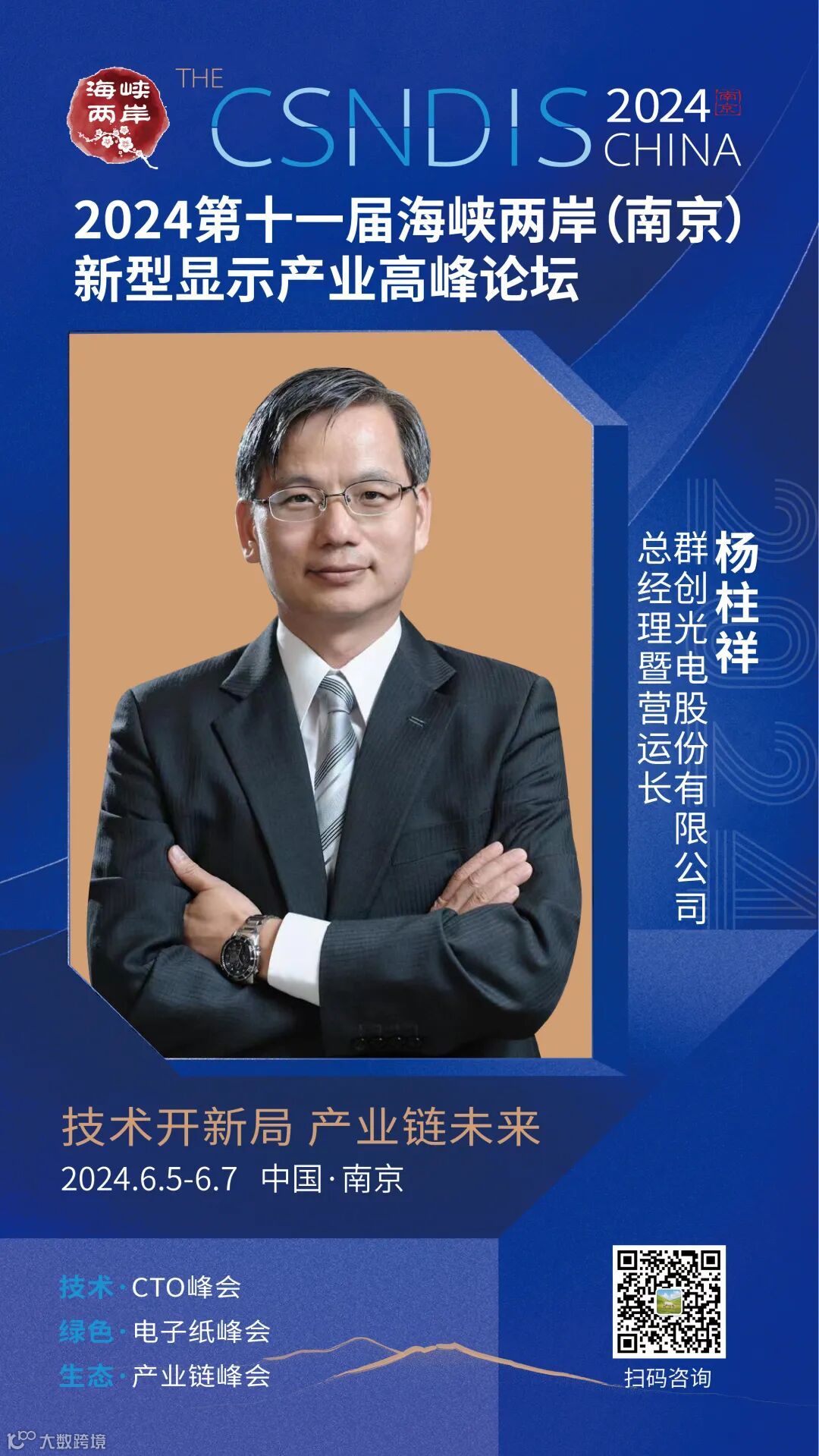 群创光电股份有限公司总经理暨营运长杨柱祥受邀将出席2024第十一届海峡两岸(南京)新型显示产业高峰论坛并发表演讲.有兴趣参会的朋友可以扫码咨询详情。
