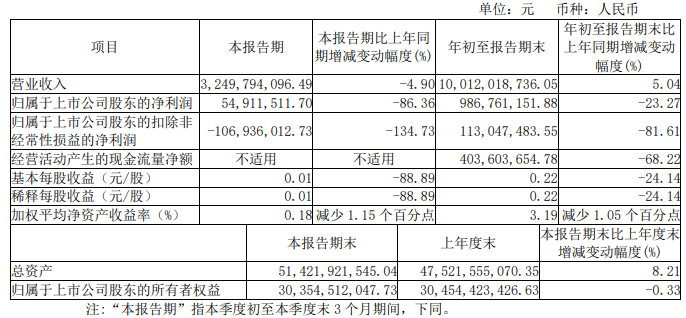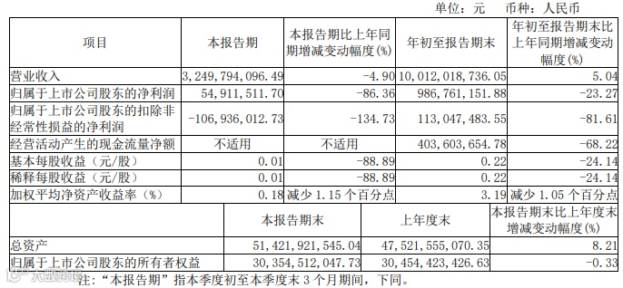 京东方第三季度营收为411.34亿元,同比降26.79%。前三季度,京东方前三季度营收为1327.44亿元,同比降19.45%;归母净利润为52.91亿元,同比降73.75%。