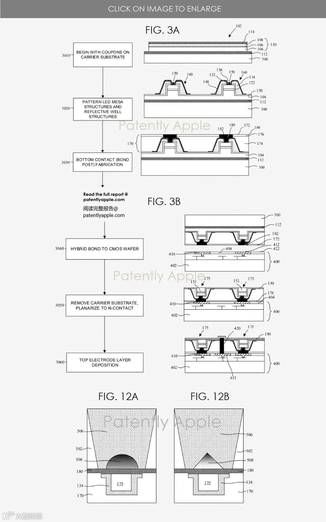 苹果公司的专利图3A包括一个工艺流程和相应的横截面侧视图说明,该方法是在载体基板上从LED试片上图案化一对LED台面结构;图3B包括一个工艺流程和相应的横截面侧视图说明,该方法是在显示基板上集成一对LED台面结构。