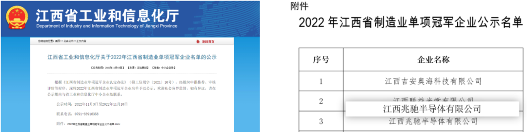 2022年年间,江西省工信厅发布《关于2022年江西省制造业单项冠军企业名单的公示》,兆驰半导体成功入选,并于11月10日通过公示。