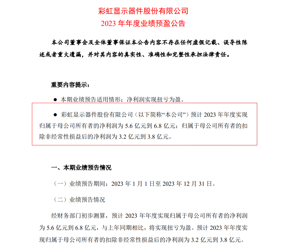 1月29日晚间,彩虹股份发布业绩预告,预计 2023 年年度实现归属于母公司所有者的净利润为 5.6 亿元到 6.8 亿元,较上年同期-26.6亿元扭亏为盈;归属于母公司所有者的扣除非经常性损益后的净利润为3.2 亿元到 3.8 亿元,较上年同期-34.8亿元扭亏为盈。