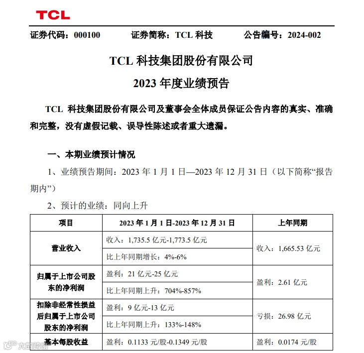 1月26日晚间,TCL科技发布业绩预告,预计2023年实现营业收入1,735.5亿元-1,773.5亿元,同比增长4%-6%;预计2023年归母净利润为21亿元~25亿元,同比预增704%~857%。
