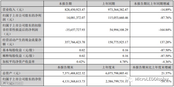 报告期内,乾照光电实现营业收入8.28亿元,同比下降14.89%;实现营业利润2,599.77万元,同比下降81.95%;归属于上市公司股东的净利润为1,408.14万元,同比下降87.76%。
