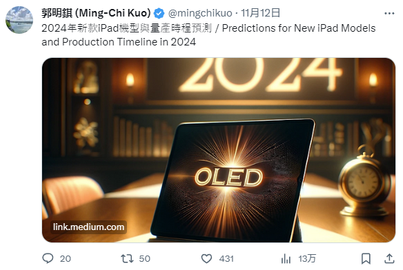 近期,知名苹果供应链分析师郭明錤发布了2024年新款iPad预测报告,新款iPad Pro将采用OLED面板取代目前的Mini LED背光面板。而12.9英寸版本的iPad Air机型则是采用了与Mini LED背光面板同款的Oxide氧化物背板以增强显示效果。