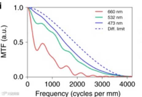 用于AR设备的透视超透镜的测量结果样本,显示了不同波长光线的强度和MTF值。(图片来源:Nature.com)