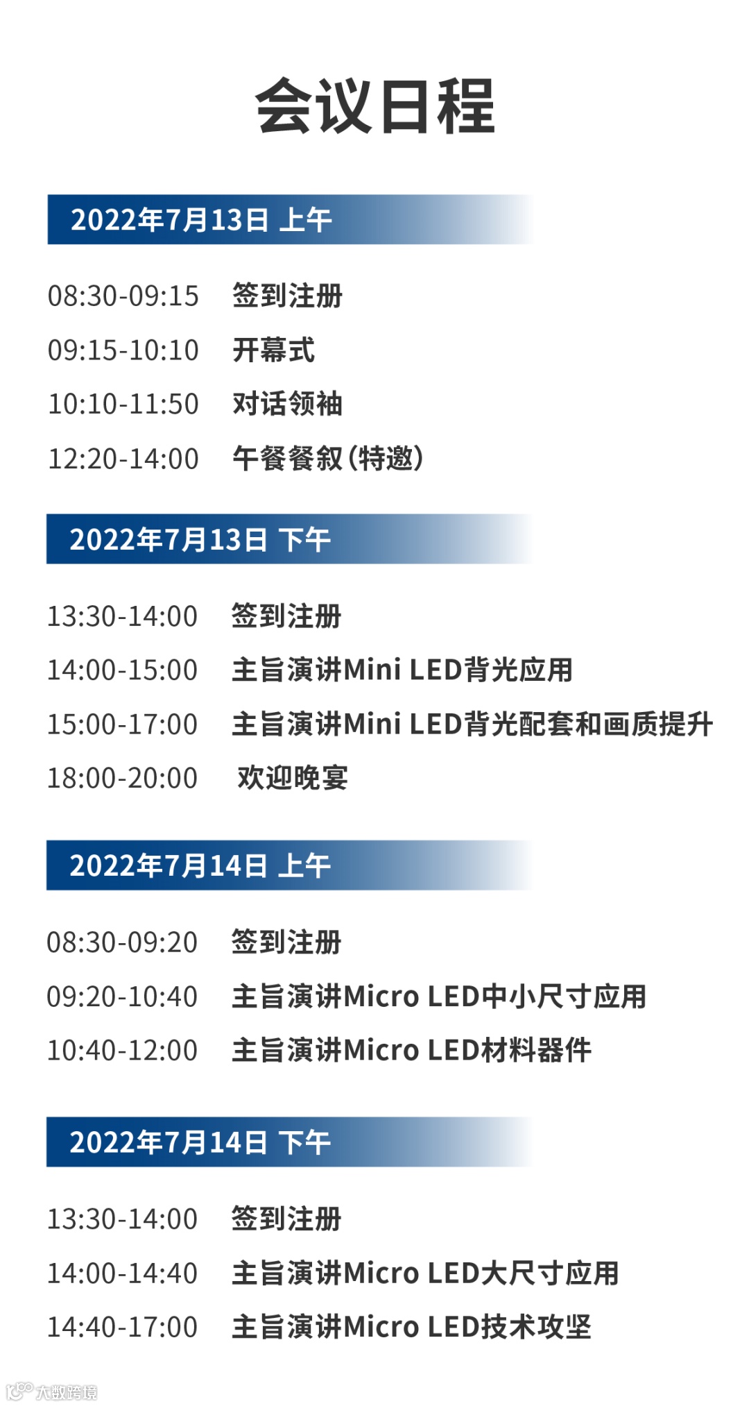 为助推Mini/Micro LED显示产业高质量发展,2022第三届全球Mini/Micro LED显示技术周将于2022年7月13-14日在深圳举行。技术周为期两天,包含了主论坛+领袖对话+Mini LED背光及Micro LED全产业链成果展示+新品集中发布周+标准发布+产业商贸、投融资对接+媒体专访、报道、直播秀等。