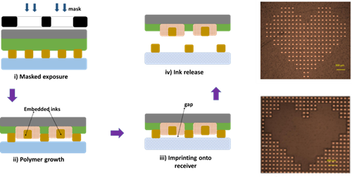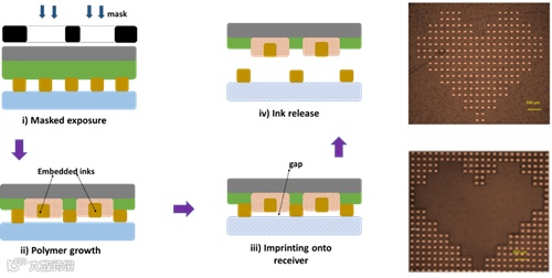 团队采用外部光照诱导聚合物生长,使光敏物质产生局部区域的凹陷和凸起,产生的高度差可实现将待转移芯片和非转移芯片选择性编程转移至目标基板。