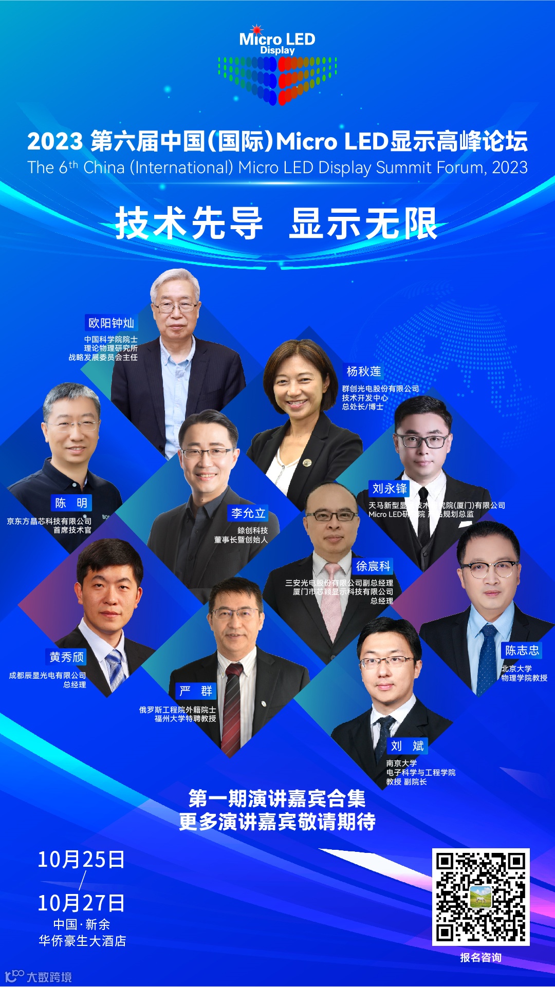 2023第六届中国(国际)Micro LED技术显示高峰论坛由南京平板显示行业协会、中国光学光电子行业协会液晶分会、中国半导体照明/LED产业与应用联盟、中国电子材料行业协会、台湾显示器产业联合总会主办,中国半导体行业协会、中国电子视像行业协会Mini/Micro LED显示产业分会协办,上海舜联投资管理有限公司承办,论坛将于2023年10月25日至27日在江西新余华侨豪生大酒店举行,本次论坛以“技术先导 显示无限”为主题,通过对技术路线的回顾和展望,聚焦Micro LED量产关键技术突破和产业链建设,展示最新技术和相应产品、推动和完善产业链安全及配套对接,促进产业链进一步健康发展。