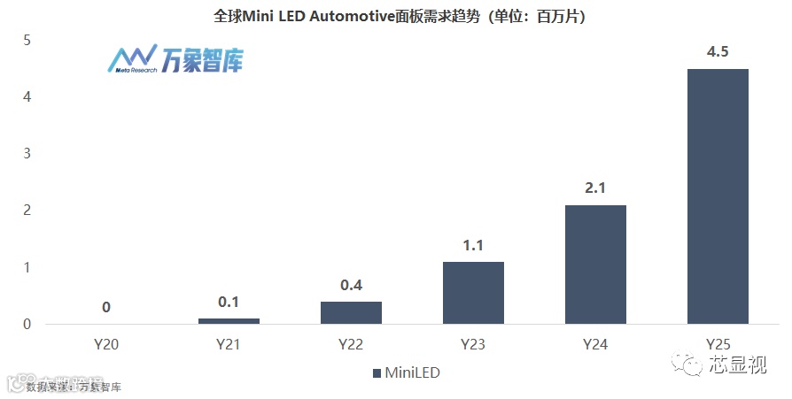 万象智库数据显示:车用Mini LED背光屏幕将从2021年的不到10万片,预计到2025年将增长到450万片,年复合增长率将高达159%。