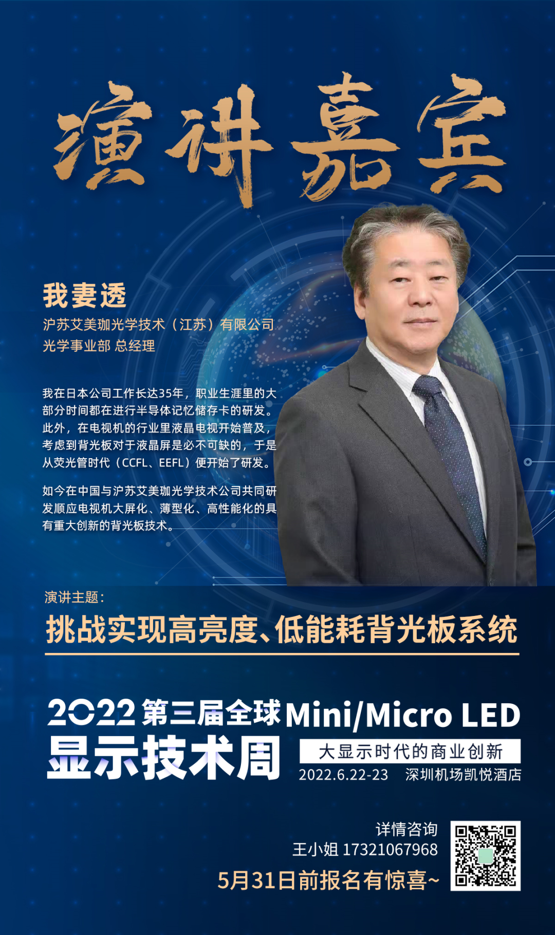 沪苏艾美珈光学技术(江苏)有限公司光学事业部总经理我妻透,受邀出席2022第三届全球Mini/Micro LED显示技术周,并将带来创新的观点,敬请期待。