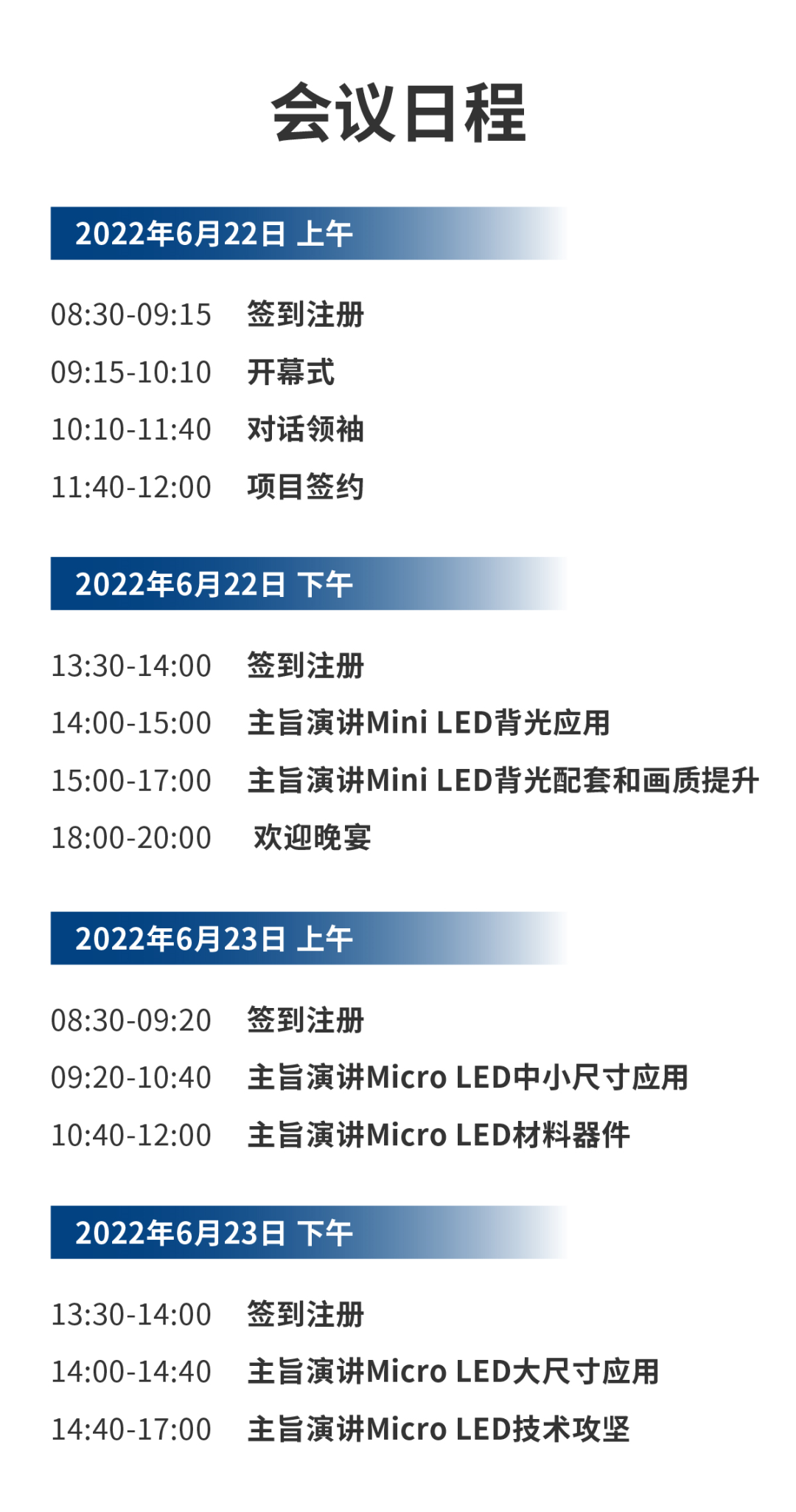为助推Mini/Micro LED显示产业高质量发展,2022第三届全球Mini/Micro LED显示技术周将于2022年6月22-23日在深圳举行。技术周为期两天,包含了主论坛+领袖对话+Mini LED背光及Micro LED全产业链成果展示+新品集中发布周+标准发布+产业商贸、投融资对接+媒体专访、报道、直播秀等。