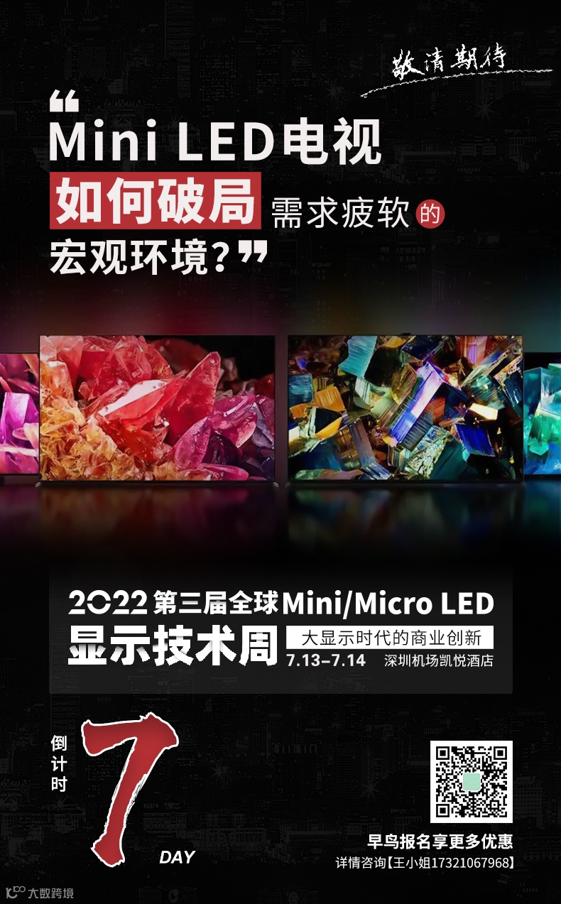 为助推Mini/Micro LED显示产业高质量发展,2022第三届全球Mini/Micro LED显示技术周将于2022年7月13-14日在深圳举行。技术周为期两天,包含了主论坛+领袖对话+Mini LED背光及Micro LED全产业链成果展示+新品集中发布周+标准发布+产业商贸、投融资对接+媒体专访、报道、直播秀等。