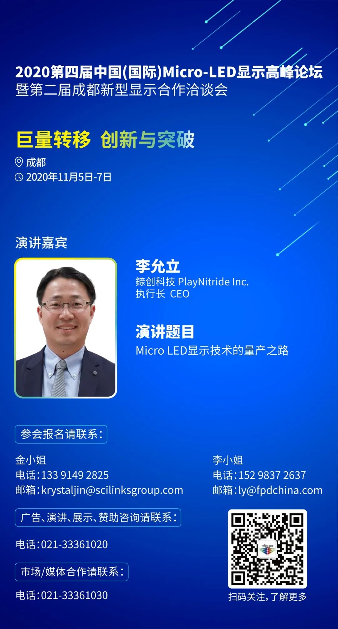 2020第四届中国(国际)Micro-LED显示高峰论坛暨第二届成都新型显示合作洽谈会将以“巨量转移 创新与突破”为主题,继续聚集显示、LED和半导体三大领域的权威学者、专家和产业链上下游的企业领袖及工程技术人员共同探讨Micro-LED的技术路线及其应用前景,尤其将集中讨论Micro-LED巨量转移技术,以促进和推动我国Micro-LED显示产业政产学研用的协同发展,从而在国际新型显示产业的未来竞争中取得优势。