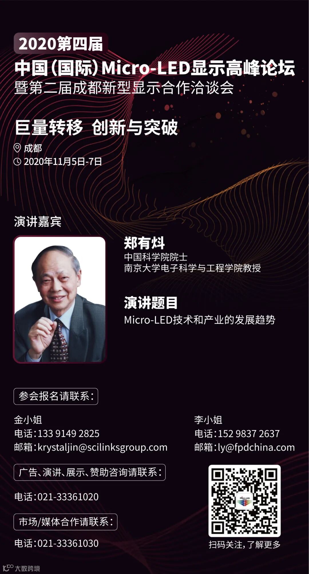 2020第四届中国(国际)Micro-LED显示高峰论坛暨第二届成都新型显示合作洽谈会将以“巨量转移 创新与突破”为主题,继续聚集显示、LED和半导体三大领域的权威学者、专家和产业链上下游的企业领袖及工程技术人员共同探讨Micro-LED的技术路线及其应用前景,尤其将集中讨论Micro-LED巨量转移技术,以促进和推动我国Micro-LED显示产业政产学研用的协同发展,从而在国际新型显示产业的未来竞争中取得优势。
