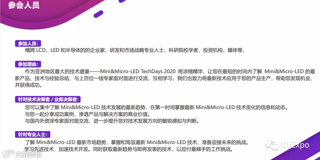 为迎接 Mini&Micro-LED 升级等市场机遇,7月31日-8月2日将在上海新国际博览中心召开的“UDE&iLife2020国际显示博览会暨未来生活博览会”为Mini&Micro-LED搭建平台,开展Mini&Micro-LED TechDays主题活动。这里将集合世界各地致力于研究 Mini&Micro-LED 技术的LCD、LED和半导体的企业家、研发和市场战略专业人士,是提供最新技术和产品展示、技术分享、市场趋势分享和产业互动的最大规模的技术盛会。