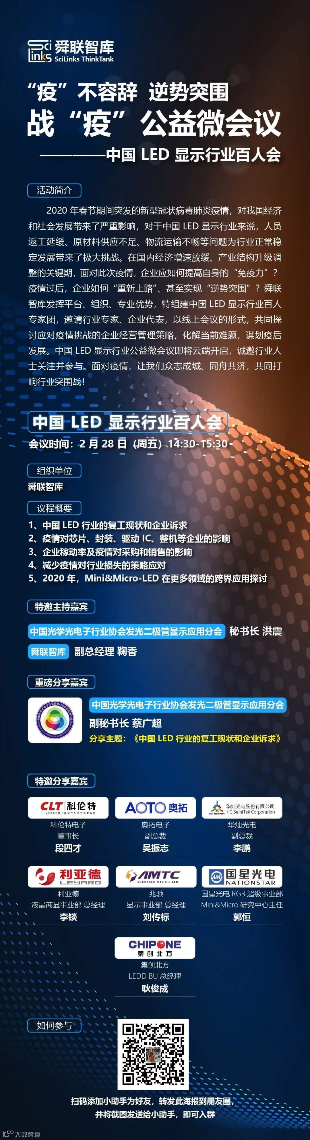 在国内经济增速放缓、产业结构升级调整的关键期,面对此次疫情,企业应如何提高自身的“免疫力”?疫情过后,企业如何“重新上路”、甚至实现“逆势突围”?舜联智库发挥平台、组织、专业优势,特组建中国LED显示行业百人专家团,邀请行业专家、企业代表,以线上直播的形式,共同探讨应对疫情挑战的企业经营管理策略,化解当前难题,谋划疫后发展。