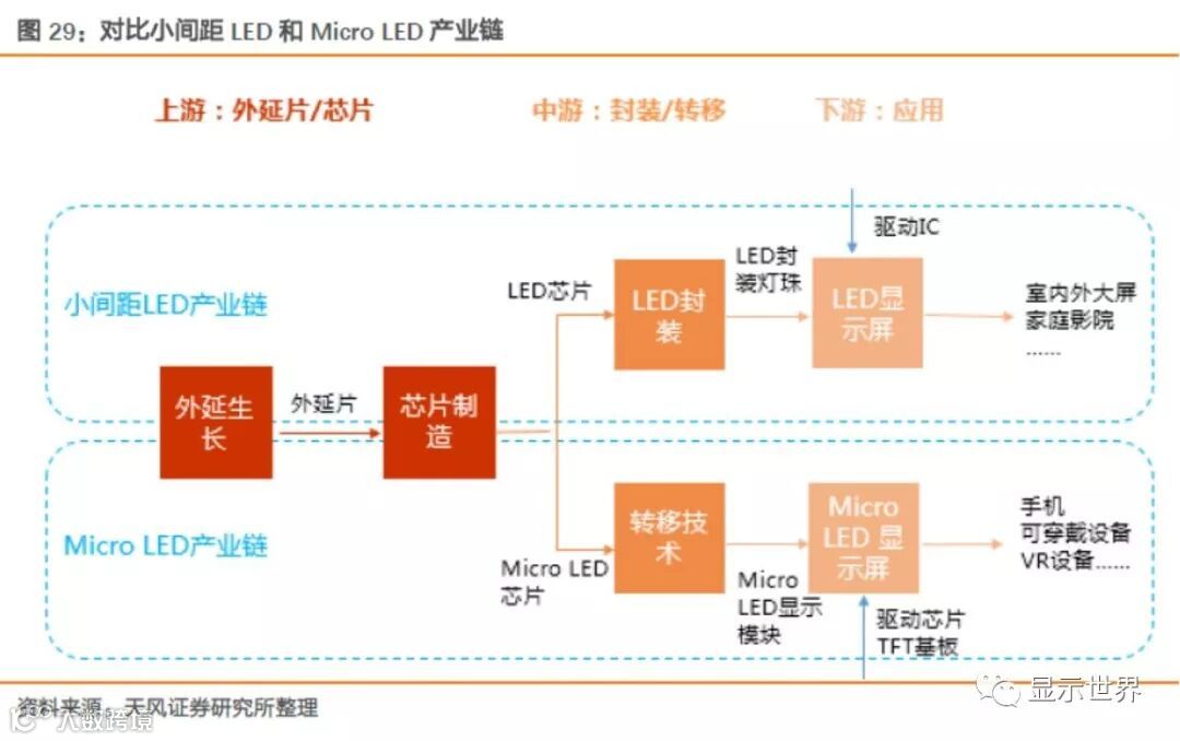 Micro LED对产业链的拉动作用与小间距LED有所不同。从产业链端来看,小间距LED和Micro LED的产业链上游均为外延片生长和芯片制造环节,但是中游和下游产业链上,小间距LED和Micro LED不同。1)中游:小间距LED的中游为传统的LED封装,现在一般采用无引线的smd封装形式;Micro LED无需对单个LED芯片单独封装,灯珠通过转移技术直接嵌于基板上,既而对整个基板进行封装。2)下游:小间距LED屏幕直接采用驱动电路连接各个灯珠进行驱动,而Micro LED显示屏则类似OLED/lcd显示屏的驱动方式,采用驱动芯片+TFT基板方式进行驱动。