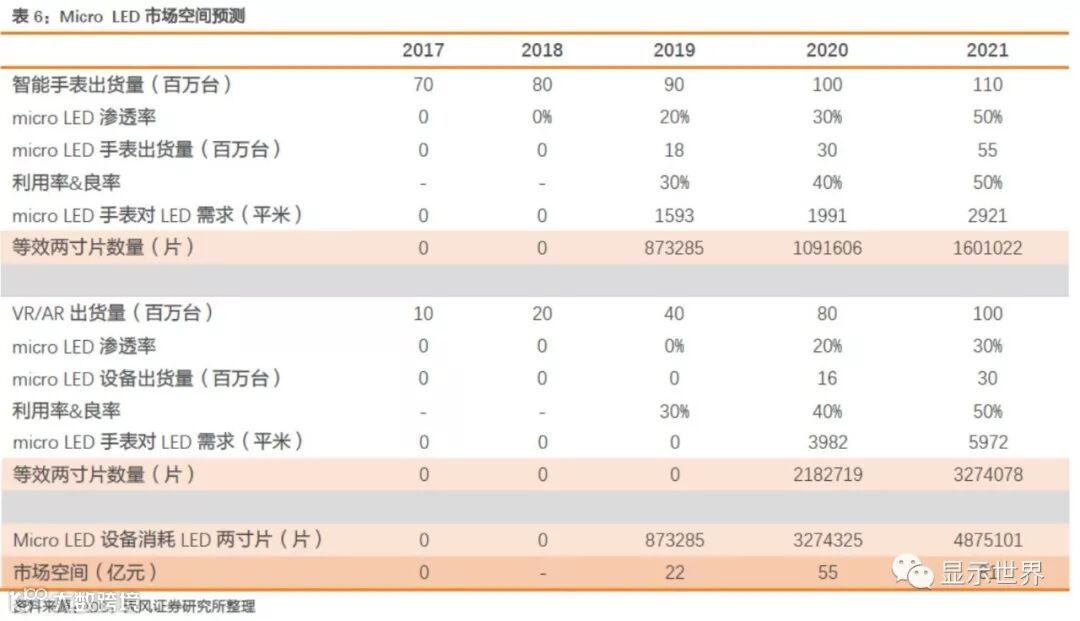 而如果智能手表和VR/AR设备中实现Micro LED100%渗透,则将消耗超过1400万片2寸片/年,占当前整个LED芯片年需求的20%左右。对应LED年产值超过200亿每年!