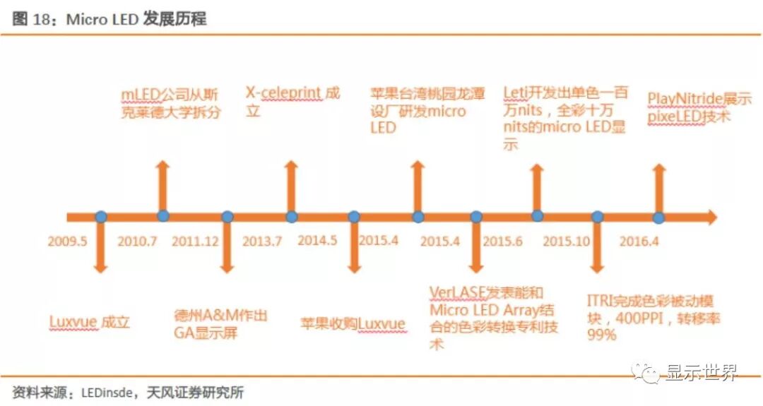 l苹果瞄准的则是以手表、手机为代表的中小尺寸显示,其运用到的技术正是Micro LED技术,即LED的微缩化与矩阵化技术。为了使LED显示屏在手机、手表上也保持较高的分辨率,Micro LED灯珠间距需要远小于小间距屏:Micro LED灯珠间距在1-100μm,其间距是当今最先进的P0.7小间距显示的1/700-1/7!Micro LED采用的技术手段也与传统的小间距LED完全不同,摒弃了传统的LED芯片封装->贴合基板->显示的形式,采用芯片“无封装”结构,通过转移技术将裸芯片直接连接于基板上。Micro LED概念最早由初创公司luxvue提出,苹果于2014年5月收购luxvue,并于2015年4月于台湾龙潭设厂研发,完成对Micro LED的技术储备。