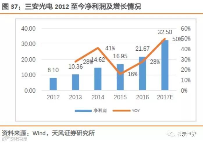 (2)此次与三星在Micro LED方面战略合作,体现了三安光电在Micro LED和MiniLED长线的布局。早在2017年6月,三安光电在全景网回复投资者提问时表示,Micro LED是未来的重点发展方向,公司在一两年前就开始在研发。据测算,Micro LED在背光和显示屏领域有10倍于目前市场的需求,有望为三安打开一片蓝海市场。