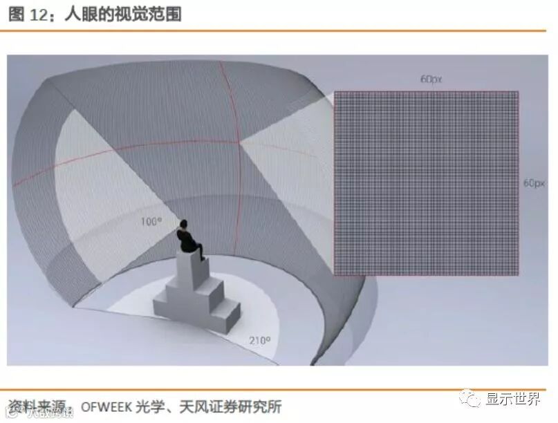 目前以SonyPlaystation和微软OculusRift为代表的主流VR设备分辨率一般为2K,在近距离接触人眼的VR头显中,2K的分辨率还是可以看到图像像素边缘的“锯齿感”。对于人眼而言,人眼的视角在1度能只能看到60个像素,所以对于人眼在水平和垂直各1度的小方块里需要有60*60个像素,以达到视网膜界别体验。人在双眼水平方向具有120度视角,垂直135度视角,整个视野范围人眼的像素极限是1亿1600万像素,对应分辨率要达到16K才能实现无锯齿显示!采用Micro LED,一方面采用20微米间距灯珠即可使头显设备实现16K显示,另一方面,Micro LED采用像素级定址、各个单独驱动的方式,采用眼球追踪技术,可以着重渲染人眼聚焦的范围,更适合于实现局部分辨率的强化和背景的虚化,模拟真实人眼视觉效果!