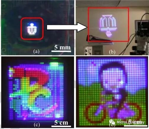 2009年,香港科技大学Z. J. Liu所在团队利用UV micro-LED阵列激发红绿蓝三色荧光粉,得到了全彩色的微LED显示芯片[7]。2010年该团队分别利用红绿蓝三种LED外延片制备出360 PPI的微LED显示芯片[8],并把三个芯片集成在一起实现了世界上首个去背光源化的全彩色微LED投影机[9]。