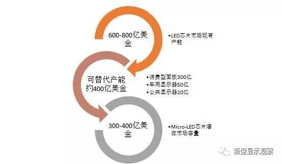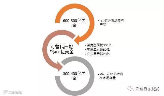 考虑MicroLED的特点,可穿戴设备与室内显示屏将是最先切入的领域。如果未来这两大领域均采用MicroLED显示,将会消耗全球LED芯片近5成的产能。市场规模可达到300-400亿美金。