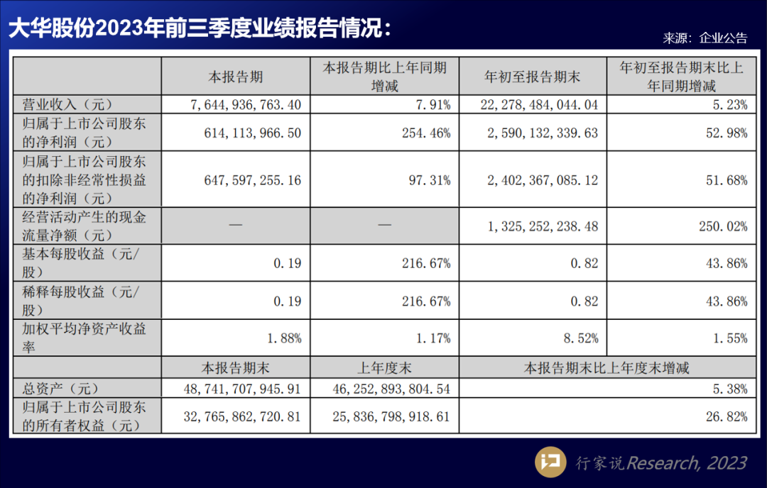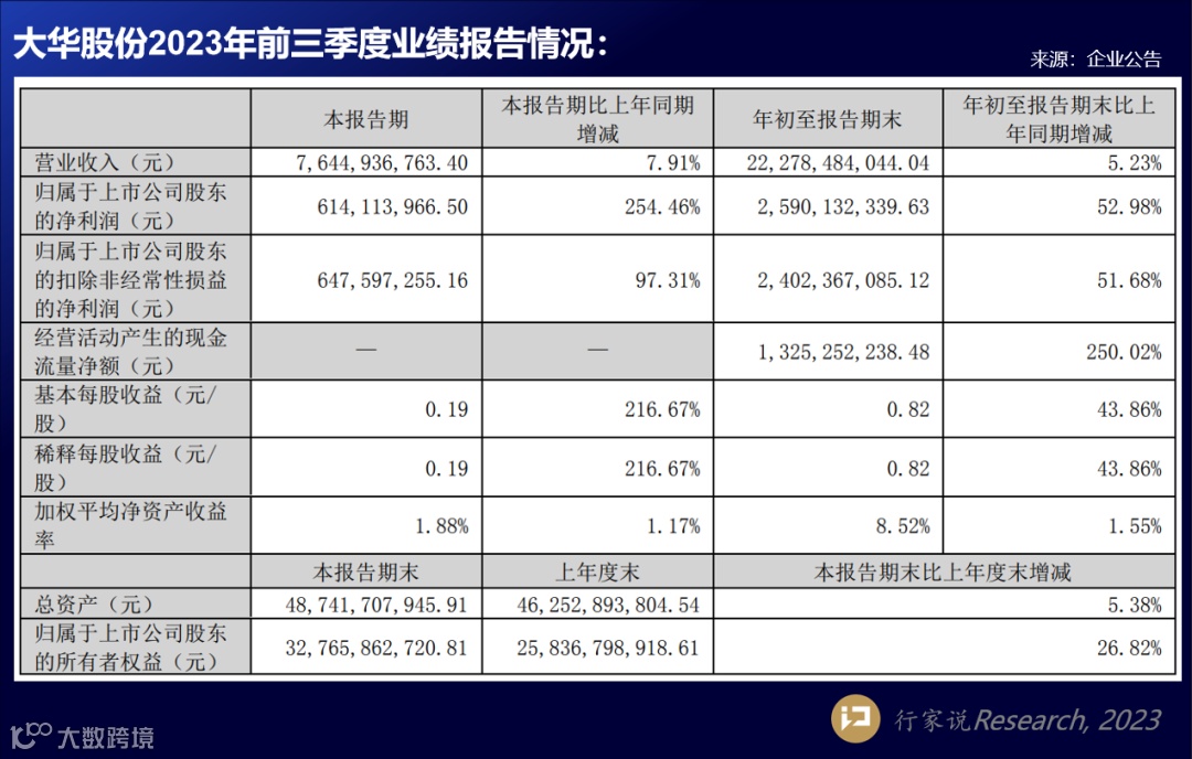 大华股份10月20日公告,公司前三季度实现营业收入222.78亿元,同比上涨5.23%;归母净利润25.9亿元,同比上涨52.98%。
