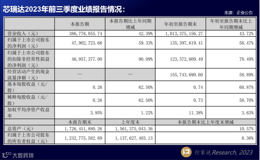 10月20日,芯瑞达发布三季度报告。2023年前三季度,实现营收10.13亿元,同比增长43.72%,实现净利润1.35亿元,同比增长58.47%。