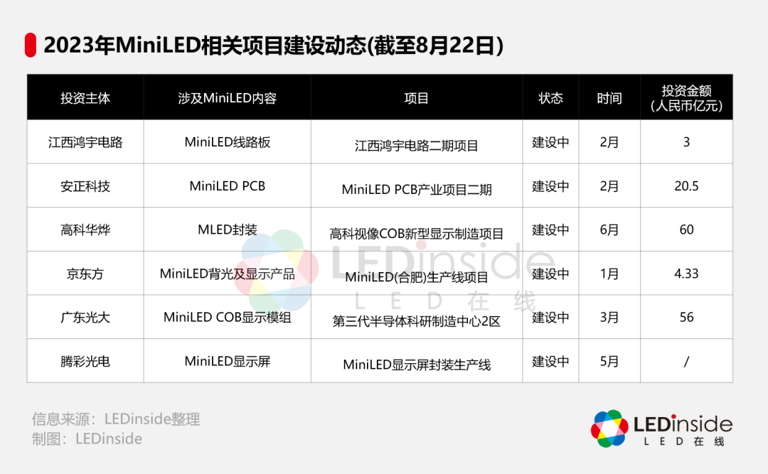 据LEDinside不完全统计,截至8月23日,今年已有28个Mini LED相关项目,进入开工、签约、竣工、投产等状态,涉及Mini LED外延、芯片、器件、背板、显示模组、背光模组等。