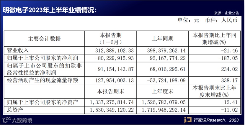 上半年,明微电子实现营收3.13亿元,同比下降21.46 %;归母净利润为-0.8亿元,同比下降187.05%;扣非归母净利润为-0.91亿元,同比下降234.02%。