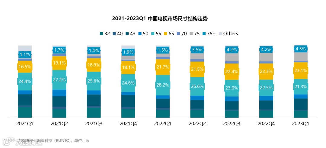 其中,根据洛图科技(RUNTO)数据,中国电视市场在2023年第一季度,65寸的市场占比已经超越 55英寸,成为第一大尺寸,75+英寸需求进入迅猛增长期。至2023年6月,中国平均尺寸已突破60英寸。