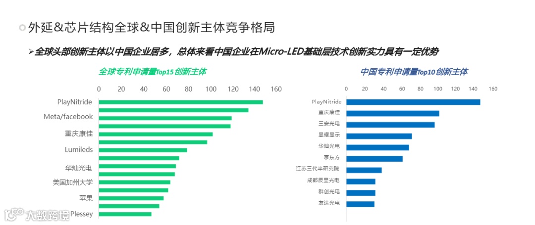 在外延&芯片结构方向,全球TOP15企业中,中国企业有5家,其中中国台湾PlavNitride、重庆康佳和三安光电在该技术方向专利总量超过100件,排进全球前5。除中国头部企业,韩国的三星、Meta专利布局量排在全球前列,中国专利申请量靠前主体与其他申请人有一定差距,总体来看,中国头部企业在该方向的创新实力具有优势。
