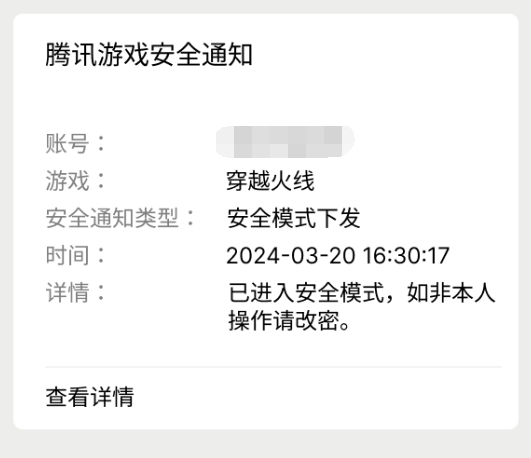 当腾讯游戏安全检测系统检测到账号发生异常时,会通过【腾讯游戏安全中心】公众号向CFer推送异常信息,并提供详细的异常情况说明,以及相应的安全功能操作指引,CFer可以根据安全指引开启相关功能,