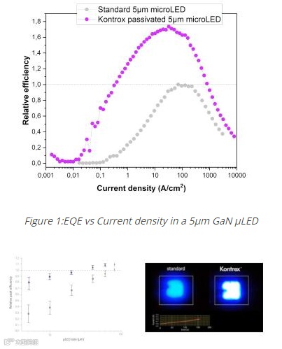 在Micro LED领域,Kontrox技术可应用于Micro LED芯片侧壁,有效钝化表面,以防止非辐射复合效应(non-radiative recombination mechanisms)造成的Micro LED效率低下,该技术可大幅提高Micro LED的性能和产量。