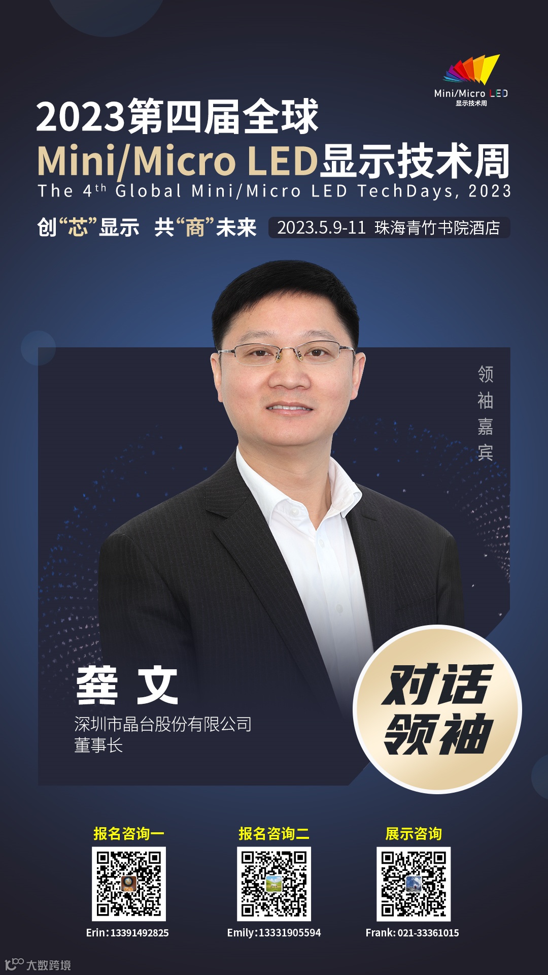 晶台股份董事长龚文将受邀出席2023第四届全球Mini/Micro LED显示技术周,分享对Mini/Micro LED显示产业发展并将带来创新观点,敬请期待。