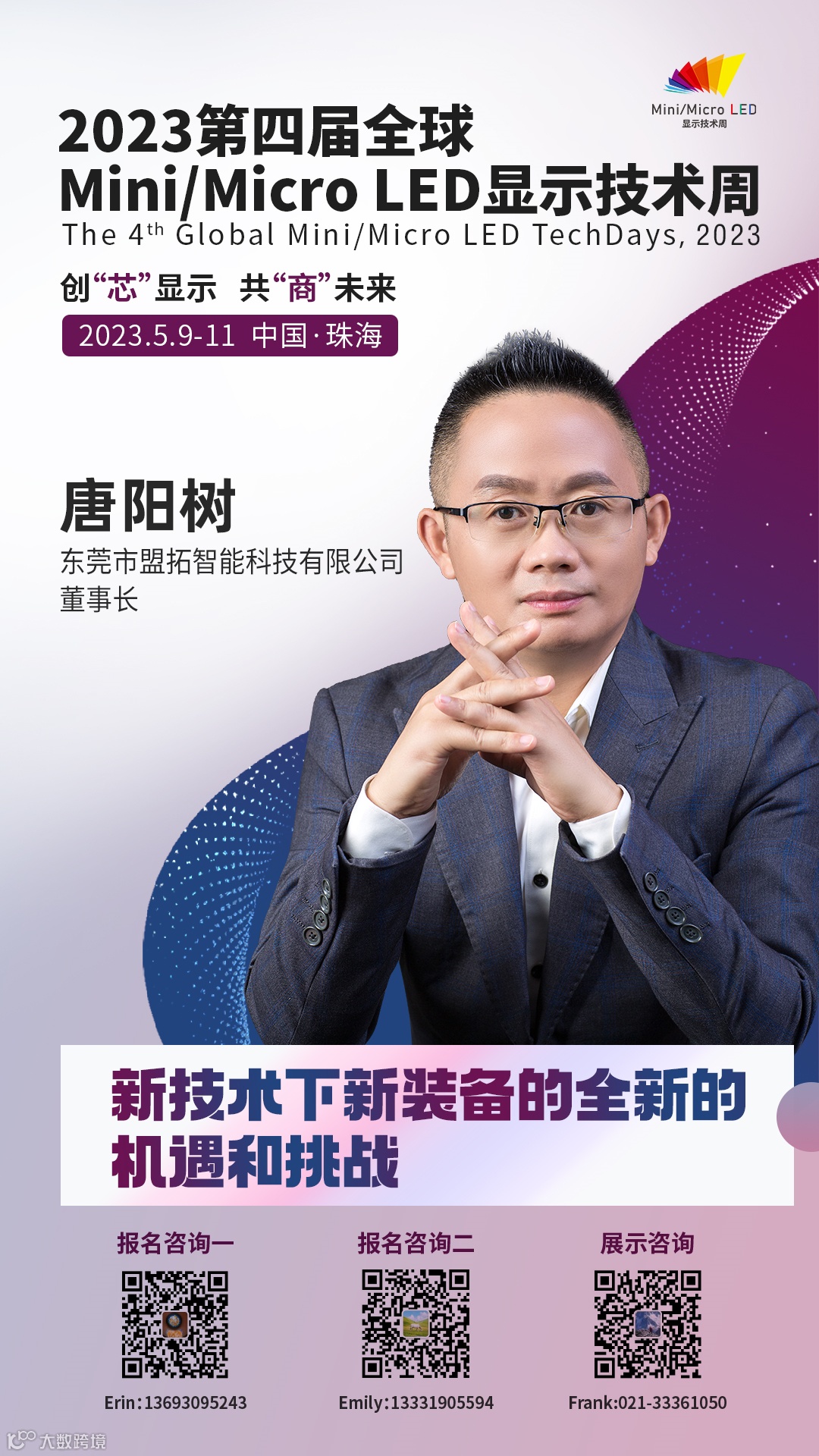 盟拓科技董事长唐阳树将出席第四届全球Mini/Micro LED显示技术周并做针对“新技术下新装备的全新的机遇和挑战”主题演讲。