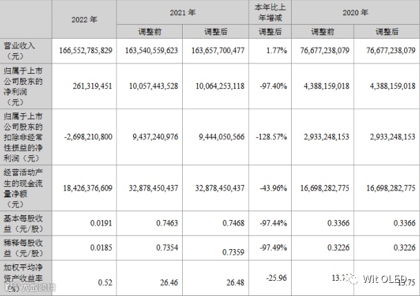 报告期内,TCL 科技实现营业收入 1,665.5 亿元,同比增长 1.8%,净利润 17.9 亿元,同比下降 88.0%,归属于上市公司股东净利润 2.6 亿元,经营现金流净额 184.3 亿元。公司业绩下滑的主要原因为:半导体显示行业景气度下行,产品价格大幅下降,半导体显示业务 2022年实现营业收入 657.2 亿元,同比下降 25.5%,出货及市占率稳步提升,TV 面板市场份额稳居全球前二;定位于 IT 产品的氧化物半导体显示产线已在广州投产,支撑中尺寸业务加速成长。面对行业下行周期,TCL 华星坚定发展信心,积极优化产能结构、完善业务组合,为未来发展储备势能。