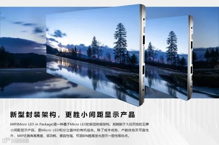 MIP(Micro LED inPackage)是一种基于Micro LED的新型封装架构,其脱胎于久经历练的王牌小间距显示产品,是Micro LED和分立器件的有机结合。除了成本优势、产能优势及可靠性外,MIP还具有高亮度、低功耗、兼容性强、可混BIN提高发光显示一致性等优点。