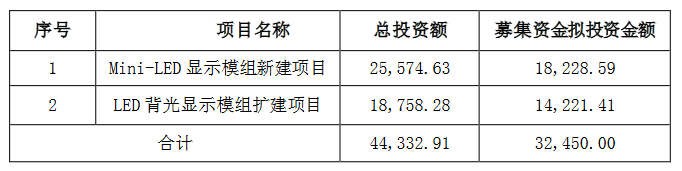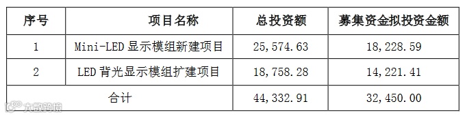 隆利科技本次发行可转换公司债券募集资金将用于投资“Mini LED显示模组新建项目”和“LED背光显示模组扩建项目”,募集资金拟投资金额分别为1.82亿元和1.42亿元。