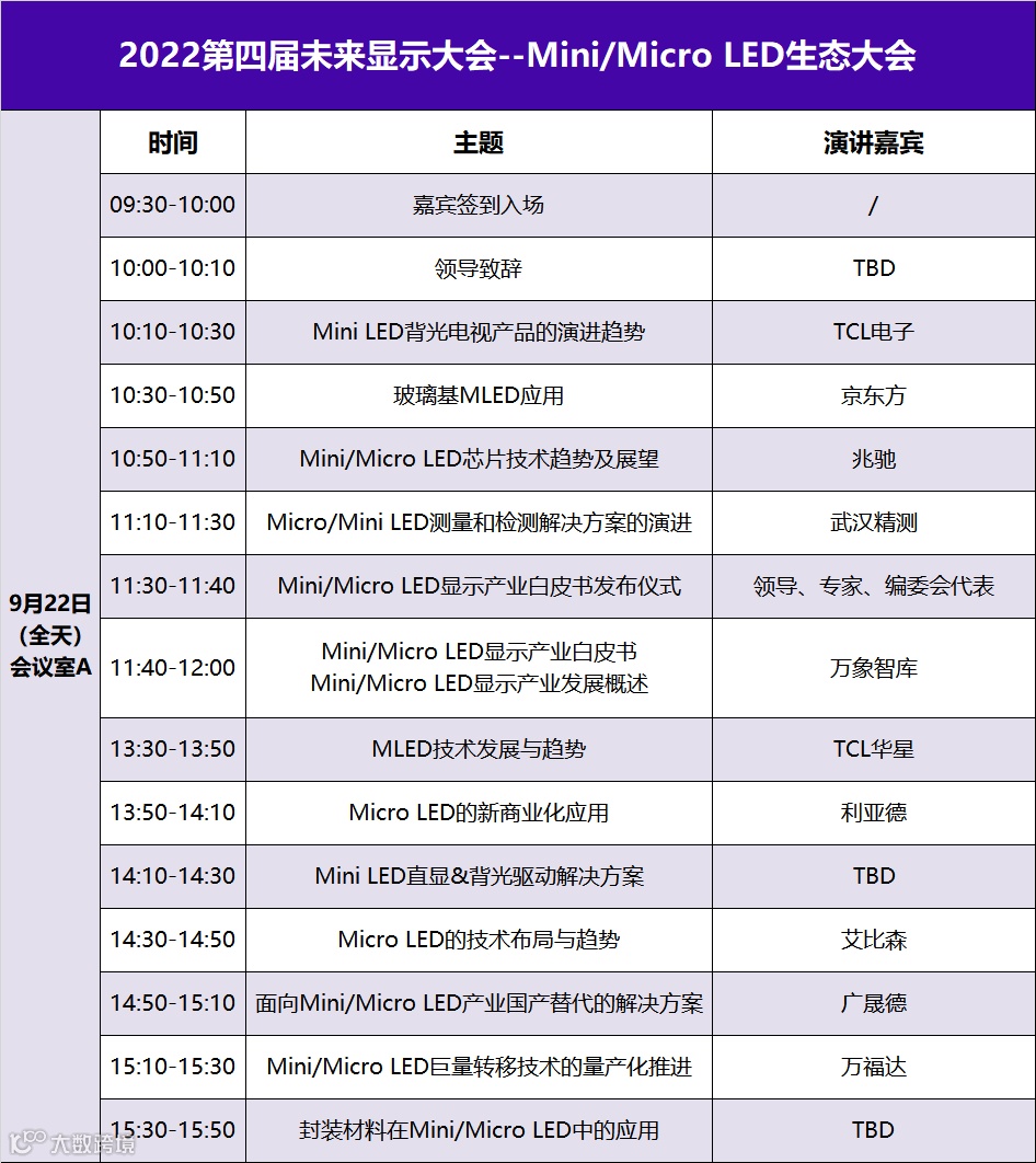 2022第四届未来显示大会--Mini/Micro LED生态大会为2022第四届未来显示大会主题论坛之一,大会共设立6个主题论坛,如您对其它论坛内容感兴趣,请持续关注我们,我们将陆续公布会议议程,敬请期待!